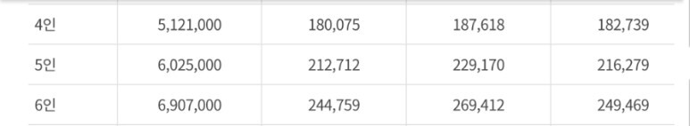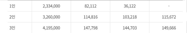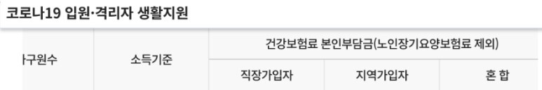 소득기준 확인은 격리 여부와 상관없이 산정된 가구원 전체의 노인장기요양보험료를 제외한 건강보험료 본인부담금을 합산한 금액이 아래의 산정기준표의 건강보험료 금액 이하인 경우에만 지원이 가능한다.