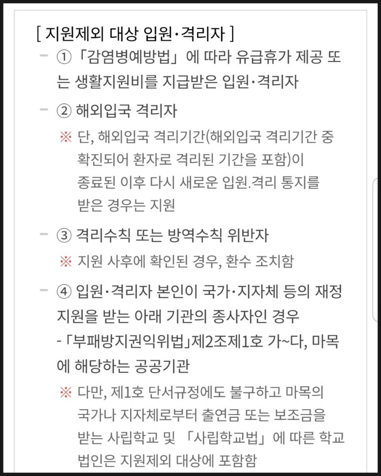 4. 입원 격리자 본인이 국가 지자체 등의 재정 지원을 받는 기관의 종사자는 지원이 제외된다.